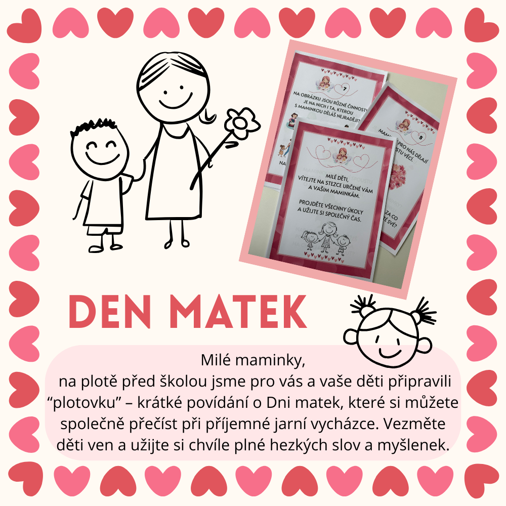 Milé maminky, na plotě před školou jsme pro vás a vaše děti připravili “plotovku” – krátké povídání o Dni matek, které si můžete společně přečíst při příjemné jarní vycházce. Vezměte děti ven a užijte si chvíle plné hezkých slov a myšlenek.