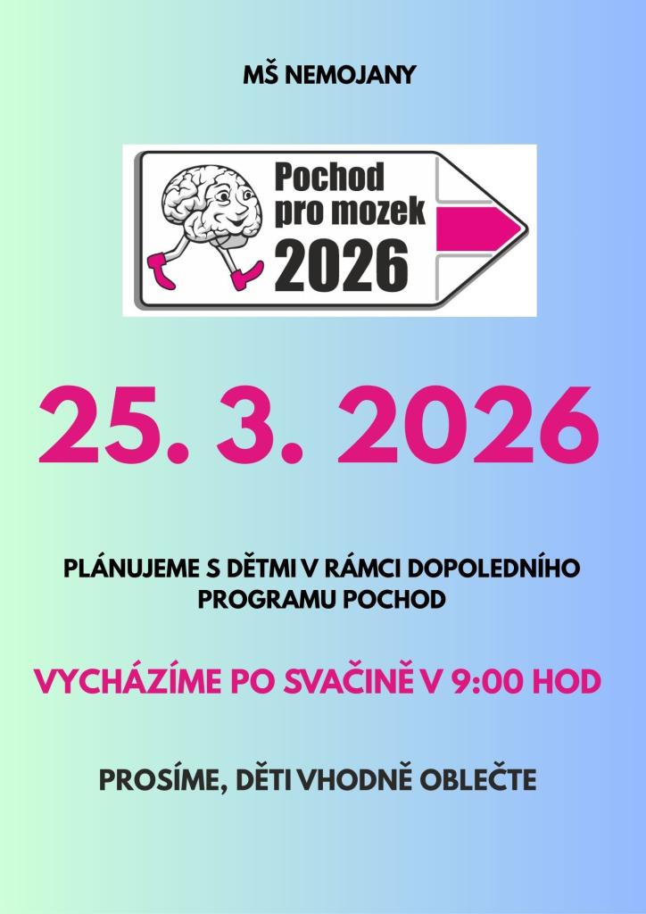 Naše mateřská škola se v rámci dopoledního programu zapojí do Pochodu pro mozek, který podporuje zdravý pohyb a péči o naši mysl. Společně si užijeme příjemnou procházku, během které si budeme povídat o tom, proč je důležité hýbat se, trávit čas venku a starat se o své zdraví.